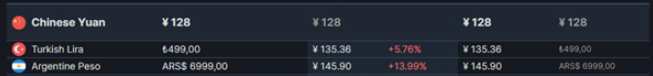 这次的新游戏价格对比中,阿根廷区和土耳其、国区是最便宜的三个区,国区最便宜,其次是土耳其,阿根廷排在第三。