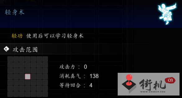 轻身:每1重轻身效果使自身移动力+1,最高叠加3层。每级效果-使用本轻功后下回合集气值+5%(10级为+50%)。