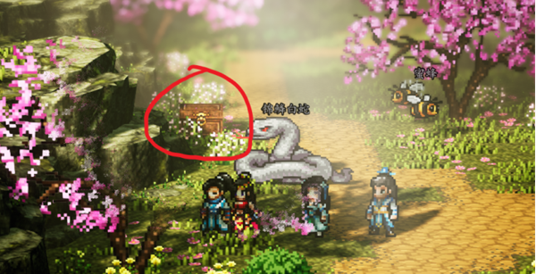 1.小伙伴们在来到游戏中的落英林的位置后,在入口的上面一点的位置后就能够看见呗树挡住的宝箱;