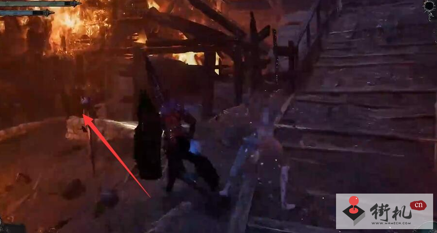 1、玩家前往被火燃烧着的村庄,前往如图位置视角往左转。